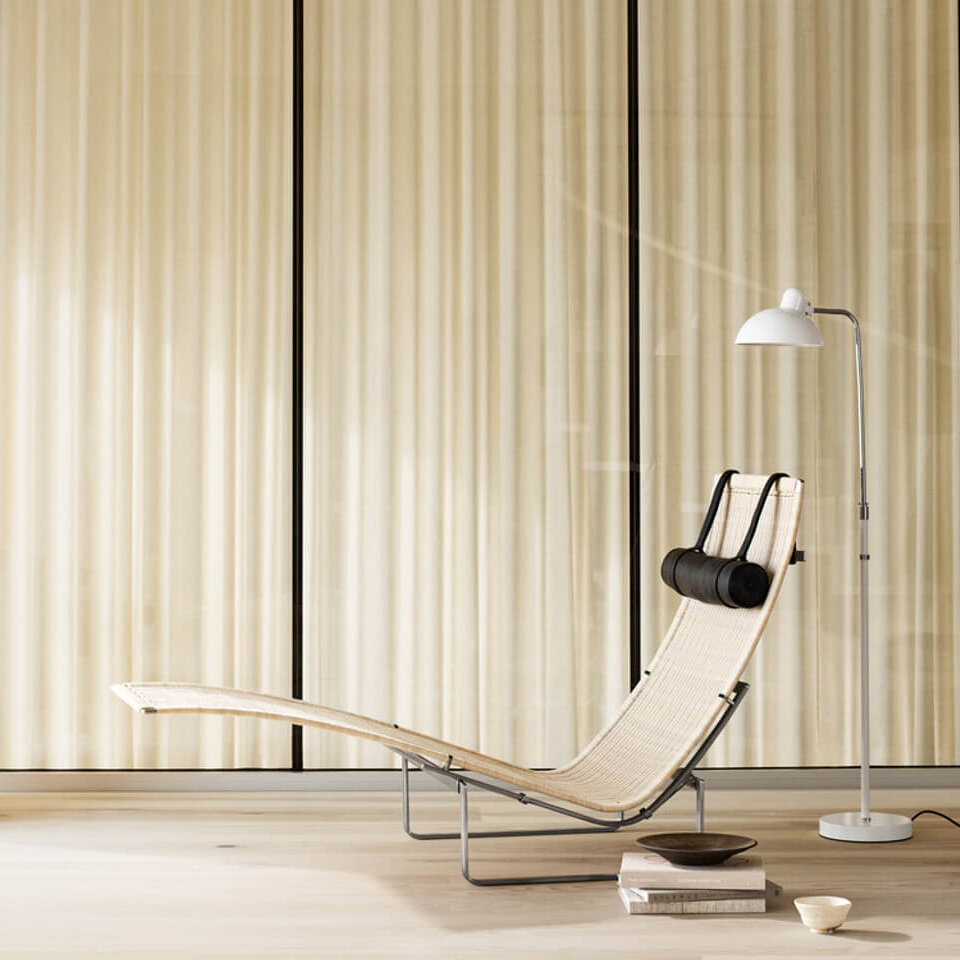 הסלון של פ. ק.24 בולט כאחד היצירות המוכרות ביותר של פול ק. ג ‘ יי. רולם, המשלב מינימליזם, דיוק תעשייתי וצורה אורגנית. העיצוב שואב השראה מתקופת הרוקוקו והטיפולוגיה הצרפתית “כיסא ארוך”—קיי פרודרהולם מפרש מחדש את ההתייחסות ההיסטורית הזו באמצעות השימוש האופייני שלו בפלדה לא נוצצת בשילוב עם חומרים ארוגים טבעיים