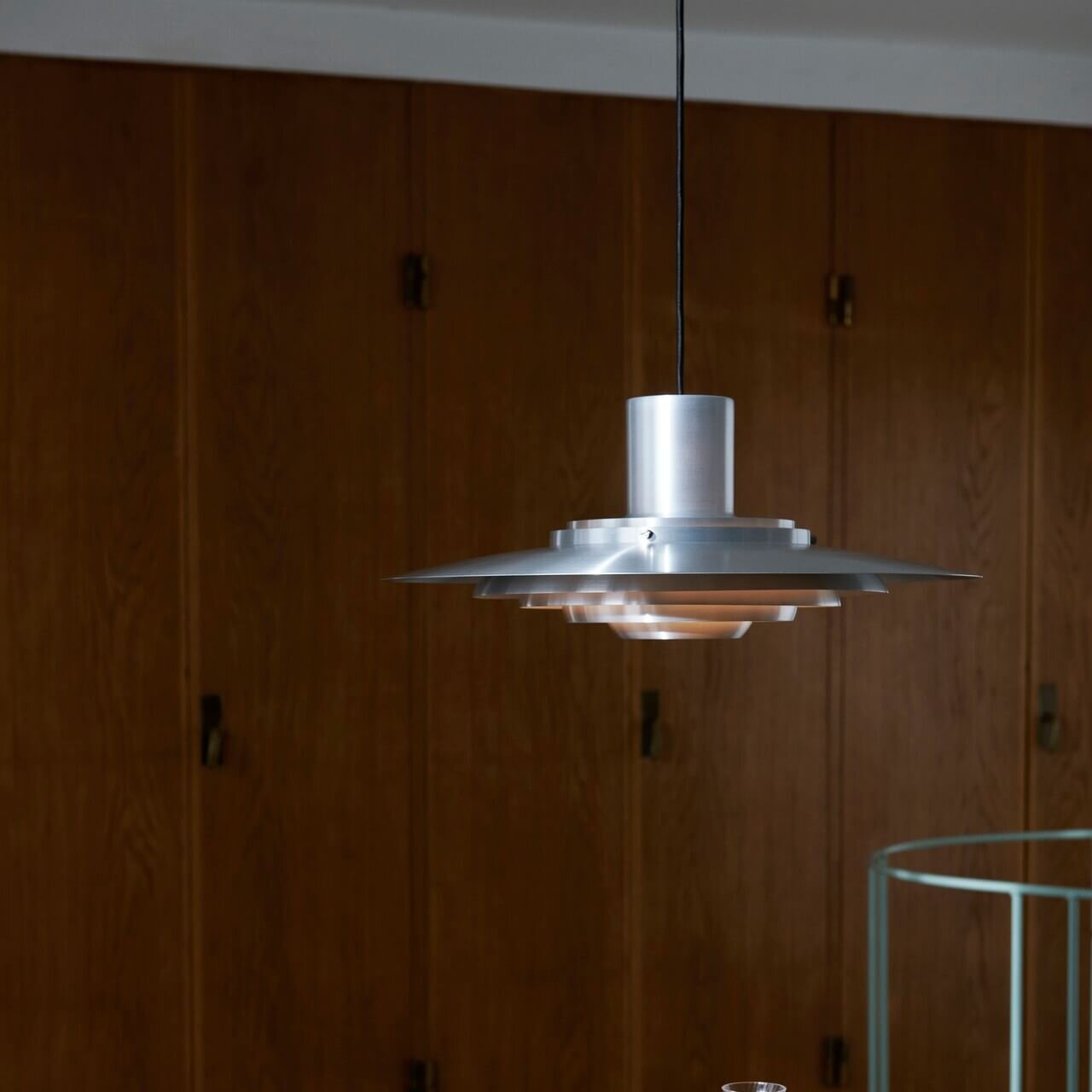 מנורת התליון של עמ ‘ 376 היא דוגמה קלאסית לעיצוב תאורה מודרני סקנדינבי של אמצע המאה, שנוצר במקור בשנת 1963 על ידי המעצבים הדנים יורגן קסטולם ופרבן יוהל פבריציוס. המנורה ידועה בצורתה המעודנת והארכיטקטונית, הבנויה מחמישה גווני אלומיניום קונצנטריים היורדים בהדרגה בגודלם ומתעקלים בעדינות פנימה לכיוון המרכז. זה עיצוב עוזר בשקט מפוזר אור כלפי מטה והחוצה תוך מניעת סנוור